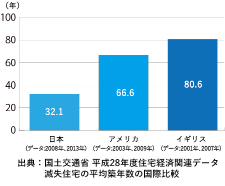 国土交通省の推計によると、滅失した日本の住宅の平均築年数は32.1年。日本の家は欧米比べて、かなり短命なのですね。