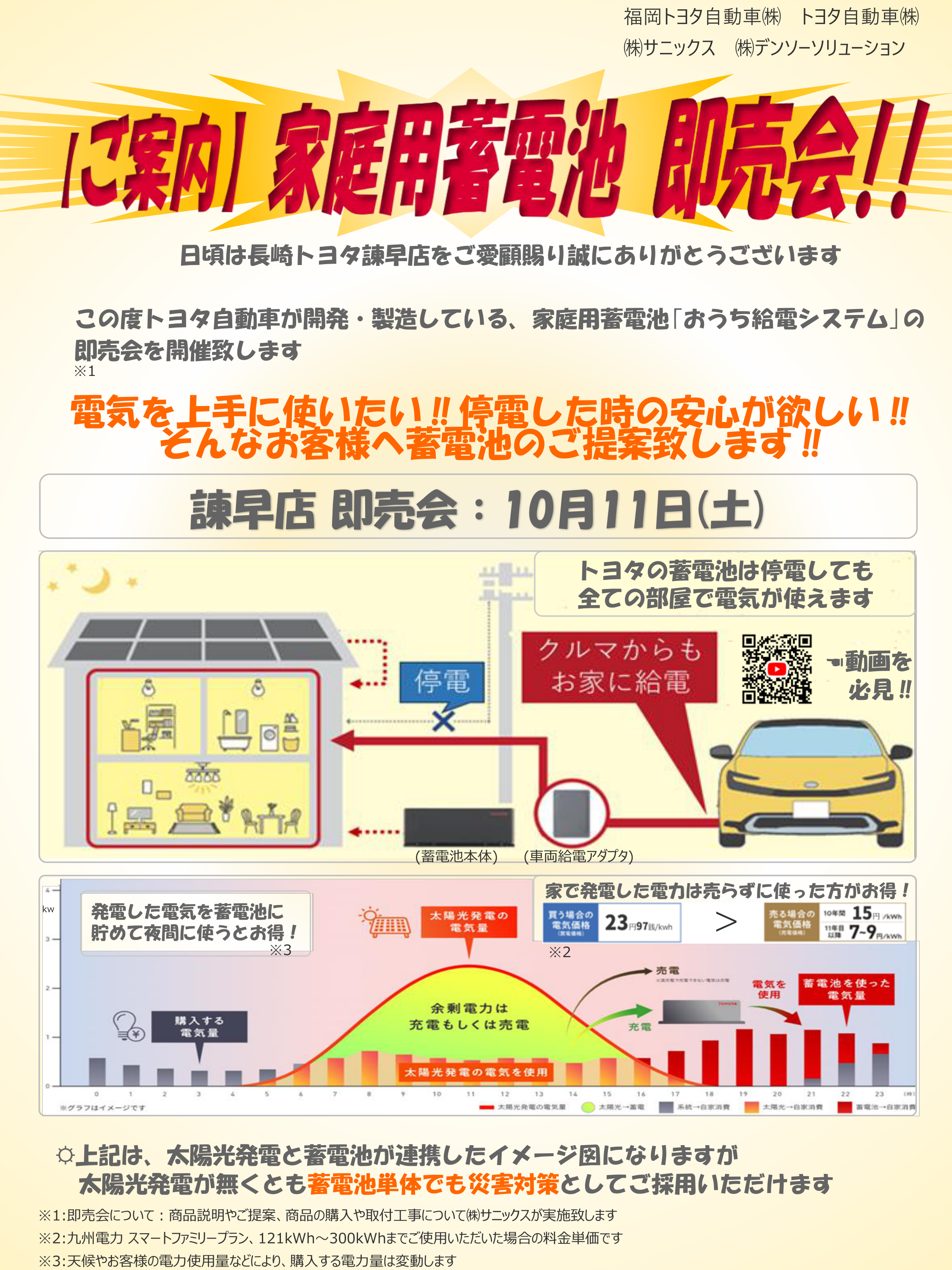 長崎県内のトヨタ販売店にて、家庭用蓄電システム(おうち給電システム)の 即売会を実施します。